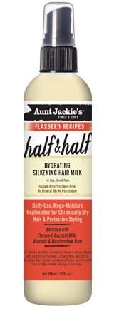 Aunt Jackie's Half & Half 355 ml: hydrating Silkening Hair Mil to add softness and moisture to hair. Rich in Omega Fatty Acids; Vitamin E, Flaxseed has been used throughout the ages to nourish hair follicles, and improve the overall health of the roots, shaft, and scalp. It is known for aiding in hair’s strength; growth, and preventing hair loss and split ends.